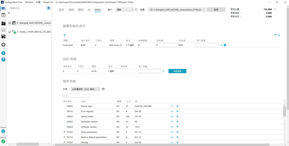 SDO 初始化指令會在每次將硬體連接至 KINGSTAR 時執行,您可將 SDO 物件新增到此區域,點一下