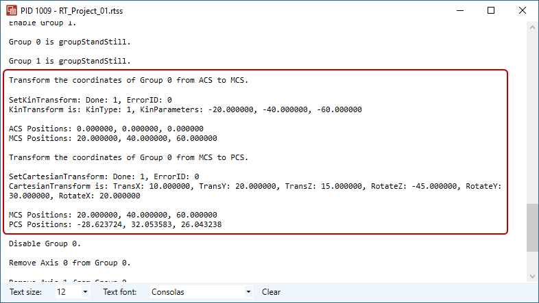 After the transformation is done, we use GetGroupPosition to retrieve the MCS and PCS positions, and display them.